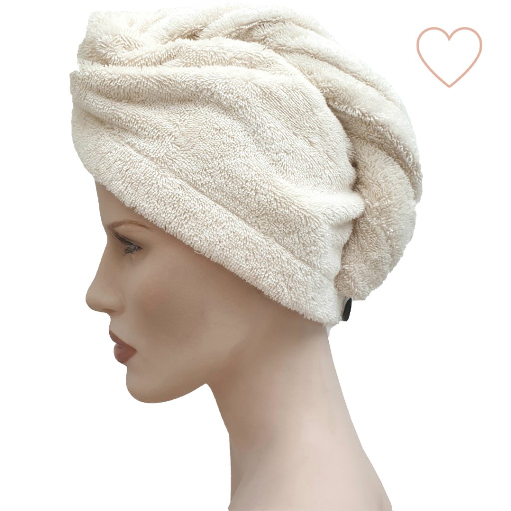 Deze écrukleurige haarhanddoek is een geweldige hulp bij de dagelijkse beautyroutine. Je verstopt je haar erin en gaat er zo mee onder de douche en je haren blijven droog. Maar je kunt er ook je natte haar mee afdrogen. Of je gebruikt ‘m als je een gezichtsmasker wilt nemen en zodat je haar niet in de weg zit. De handdoek is gemaakt van biokatoen (GOTS gecertificeerd, van het merk Bo Weevil). Er is een gebruiksaanwijzing bijgeleverd, die legt uit hoe je de haarhanddoek precies aanbrengt.