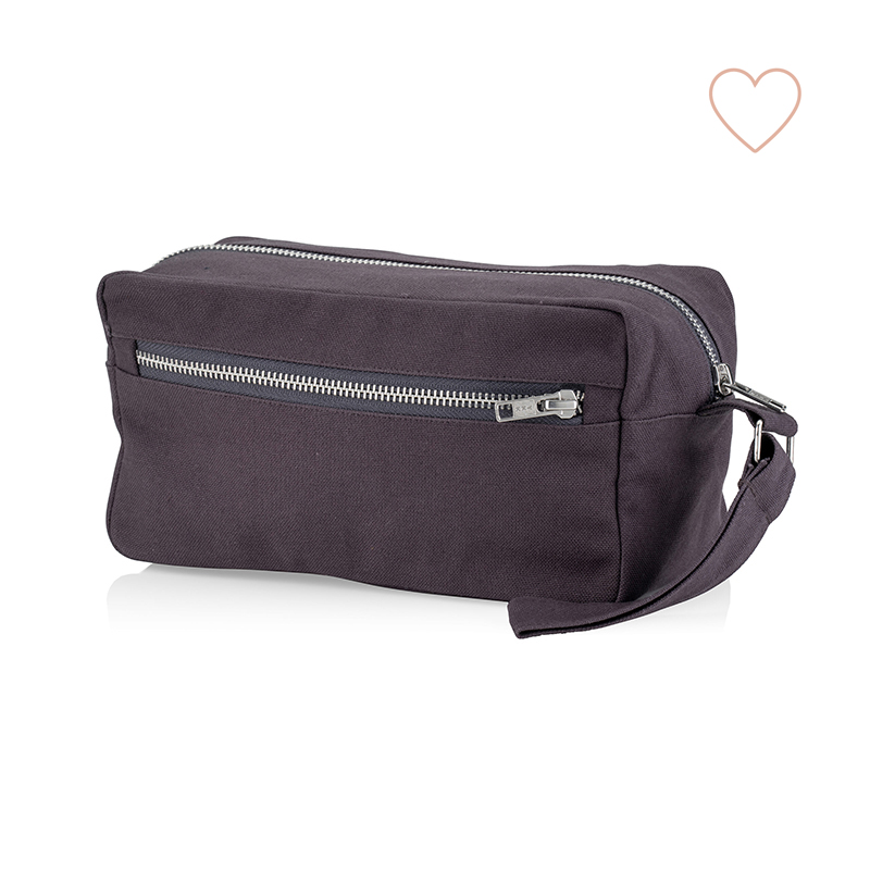 Deze mooie en stoere toilettas van biokatoenen canvas (GOTS gecertificeerd) is een stoer en praktisch item voor elke man. Maar ook voor een stoere vrouw is hij erg mooi. Twee vakken en twee ritsen om een hoop spulletjes in op te bergen. De toilettas heeft een mooi handvat, een stevige lus waarmee je ‘m kunt oppakken en ophangen. De afmetingen zijn: 22,5 cm breed, 11,5 cm hoog en de bodem is 10,5 cm breed. Let op: de kleur van de toilettas noemen wij antraciet maar in bepaald licht kan het ook auberginekleurig lijken.Ingrediënten