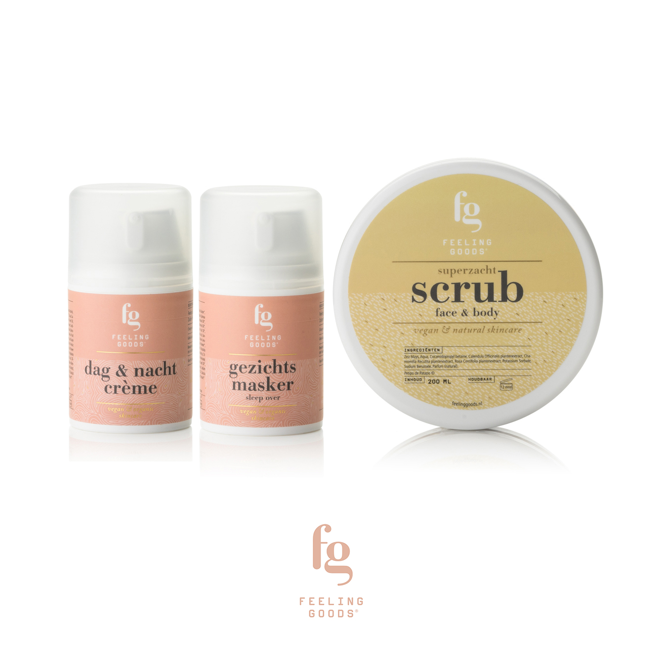 Deze fijne gezichtsverzorgingsset van Feeling Goods geeft je huid een heerlijke boost... Dag & nachtcrème (50 ml) Deze natuurlijke dag & nachtcrème is speciaal ontwikkeld voor een normale en gemengde huid. De crème houdt de natuurlijke glans van de huid en de vochtbalans in evenwicht. De toegevoegde biologische aloë vera, sheaboter en arganolie versterken elkaar en hebben een verzachtende en herstellende werking op de huid. Na reiniging met reinigingsmelk en/of reinigingsgel of –lotion, de natuurlijke dag- en nachtcrème ’s morgens en ’s avonds dun aanbrengen op de schone huid. Gezichtsmasker (50 ml) Dit voedende, natuurlijke (sleep over) gezichtsmasker geeft een vermoeide en vochtarme huid weer veerkracht en vitaliteit. De specifieke huidvoedende biologische oliën en kruiden (onder andere macadamia-, amandel-, jojoba- en rosehipolie, teunisbloem en calendula) maken dat je gezicht zijdezacht aanvoelt. Geschikt voor alle huidtypen. Breng de crème royaal aan op je gezicht en laat deze ongeveer 20 minuten inwerken. Verwijder daarna de overtollige crème. Er kan eventueel een lichte reactie optreden van de huid door de werkende bestanddelen. Je kunt het masker ook aanbrengen voordat je gaat slapen (sleep over mask). De volgende ochtend is de crème geheel in de huid opgenomen en voelt zijdezacht aan. Scrub face & body (200 ml) Onze prijswinnende en vegan scrub face & body is superzacht en verwijdert alle dode huidcellen en oneffenheden van de huid. Neem wat van de natuurlijke scrub in de hand, beetje water erbij en inmasseren op een vochtige huid. Daarna afspoelen. Resultaat: een zijdezacht huidje! Twee tot maximaal drie keer per week gebruiken. Geschikt voor lichaam én gezicht. Bewaaradvies: bewaar de pot op een droge plek en neem voordat je gaat douchen wat scrub op een schoteltje en sluit de pot goed af.Ingrediënten