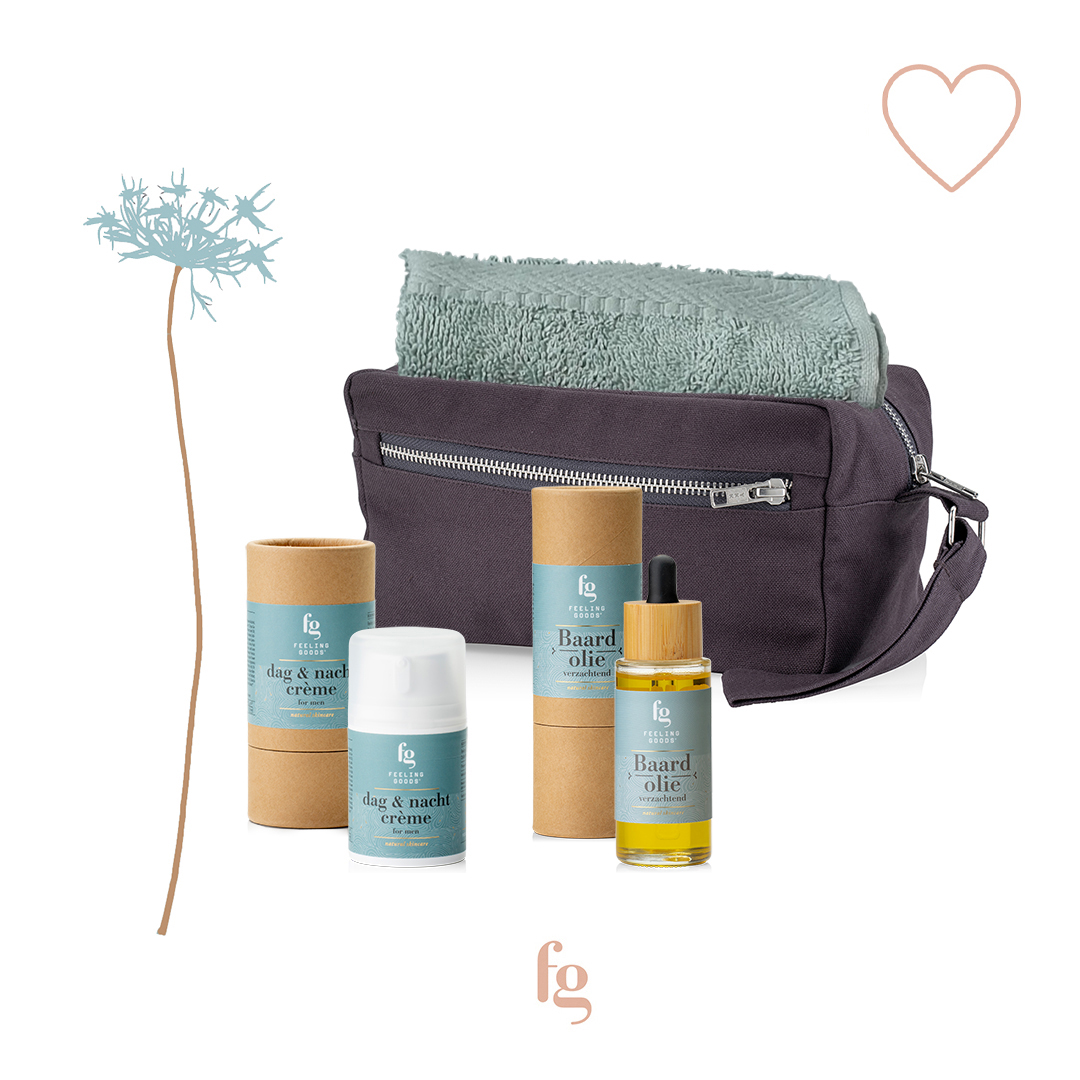Verzorgingsset man: gezichtscrème, baardolie, toilettas, gezichtsdoekje
